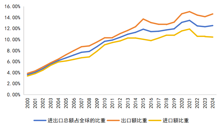 从全球视角来看,2000年至2024年间,中国对外贸易在全球贸易体系中的地位显著提升。2000年,中国进出口总额仅占全球贸易的3.62%,出口占比为3.86%,进口占比为3.38%。随着加入世界贸易组织和全球产业链分工的深化,中国外贸比重快速上升。到2021年,中国进出口总额占全球比重升至13.47%,即使在全球疫情冲击下,中国外贸仍然表现出较强韧性,创历史新高。2022年以来,中国外贸占比有所回落,但仍保持在较高水平。到2024年,进出口总额占全球贸易的12.53%,出口和进口占比分别为14.64%和10.44%。中国早已超过世界其他国家,在全球贸易版图中占据重要位置。