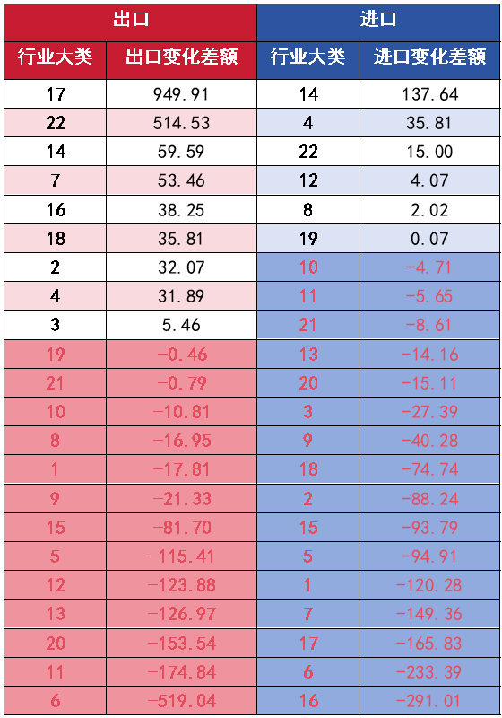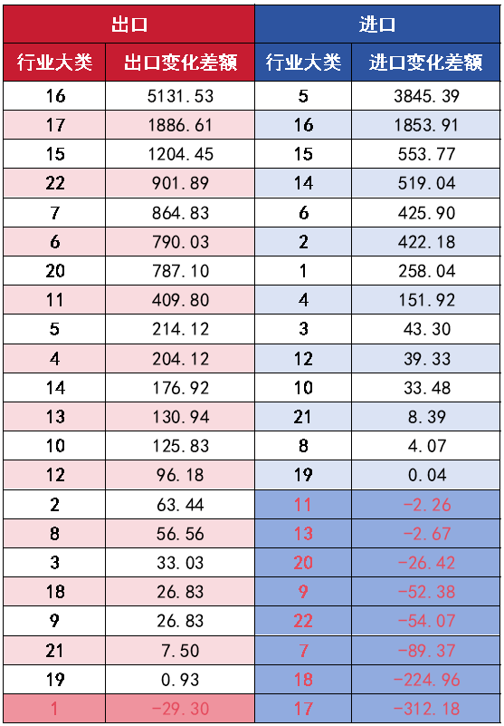 表6 2024年相对于2022年行业大类进出口贸易金额的变化(单位:亿美元)