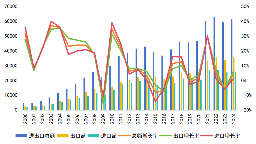 从2000年至2024年,中国对外贸易总体呈持续增长态势,进出口总额由2000年的4742.97亿美元上升至2024年的61622.89亿美元,增长逾十二倍。2000年代初期,中国外贸进入快速发展阶段,2001年加入世界贸易组织后,进出口额连续多年保持两位数增长,其中2003—2007年间年均增速超过20%,2004年进出口总额首次突破万亿美元,达到11547.58亿美元,增长35.93%。2008年全球金融危机对中国外贸造成明显冲击,2009年进出口额同比下降13.88%,为加入WTO以来少见的负增长。此后外贸逐步恢复,2010年实现强劲反弹,增幅达34.72%。2015—2016年期间受全球需求疲软及国内结构调整影响,进出口再次出现下滑。进入2017年后,中国外贸总体恢复增长,2021年增幅达到29.81%,进出口总额超过6万亿美元,创历史新高。2022年至2024年增速趋缓,呈现稳中有升的态势,2024年进出口总额为61622.89亿美元,同比增长3.81%。贸易总量虽然有一定波动,但总体来看中国的对外贸易保持了稳定增长。按照中国海关和国家统计局发布的年度统计报告,按人民币计价的中国历年对外贸易金额变化波动较小。