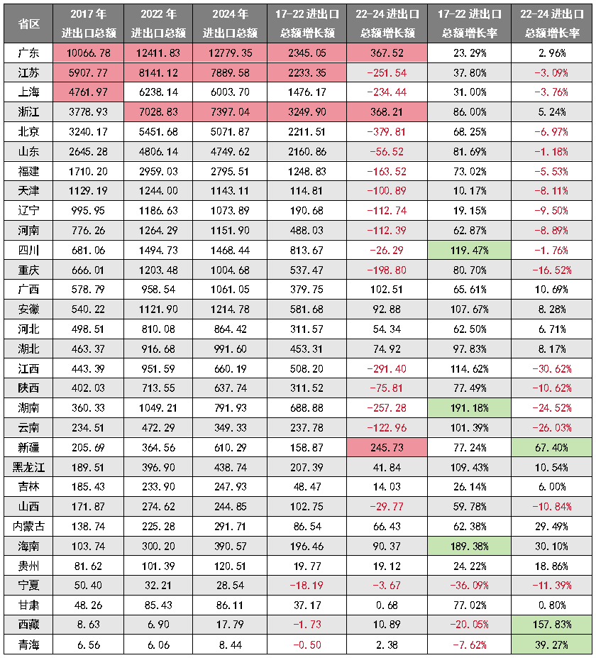 表7 2017年、2022年、2024年各省区进出口总额增长情况(单位:亿美元)