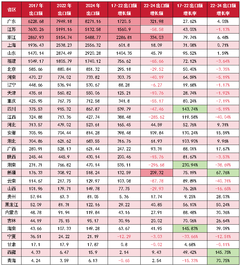 表8 2017年、2022年、2024年各省区出口额增长情况(单位:亿美元)