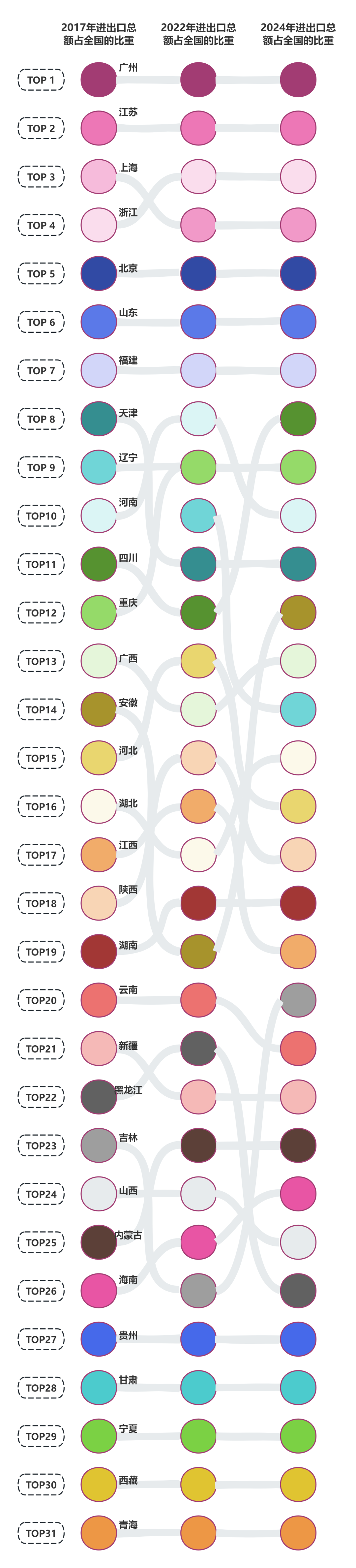 2017年至2024年间,中国外贸的省区格局总体稳定,但内部排序存在一些变化。从整体趋势看,广东、江苏、上海、浙江、北京等省市始终占据第一梯队,进出口规模显著领先,显示出其在外贸中的重要地位。同时,部分中西部省份的进出口总额排名有所上升,活跃度提升,反映出产业转移和“一带一路”倡议对内陆地区外贸的带动作用。总体来看,沿海省份继续发挥主力军作用,而中西部地区的增长潜力正在逐步释放,区域发展更趋均衡。