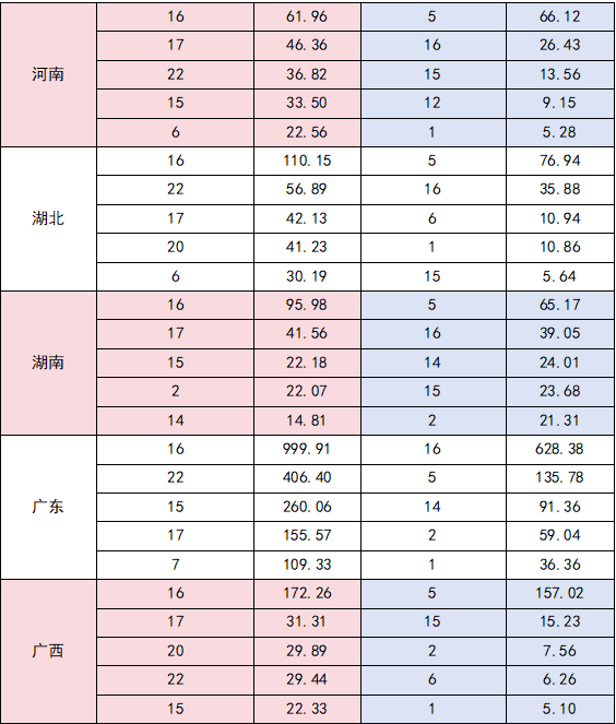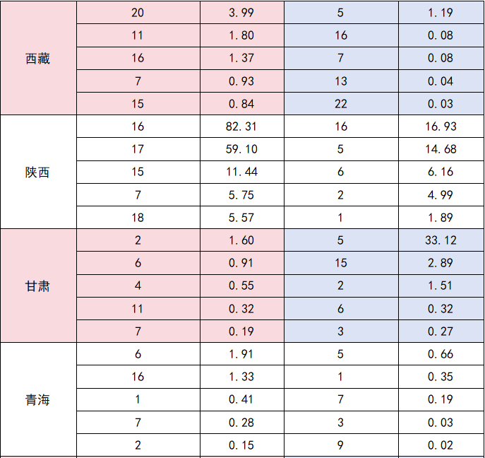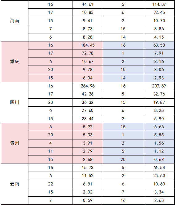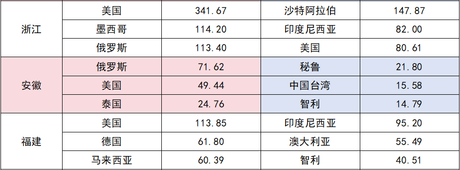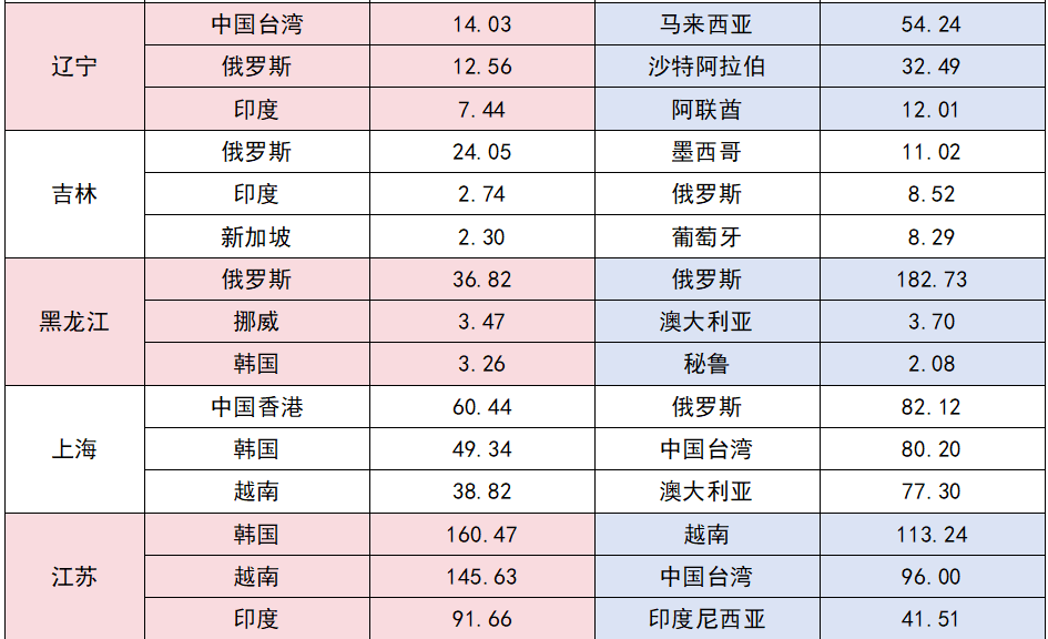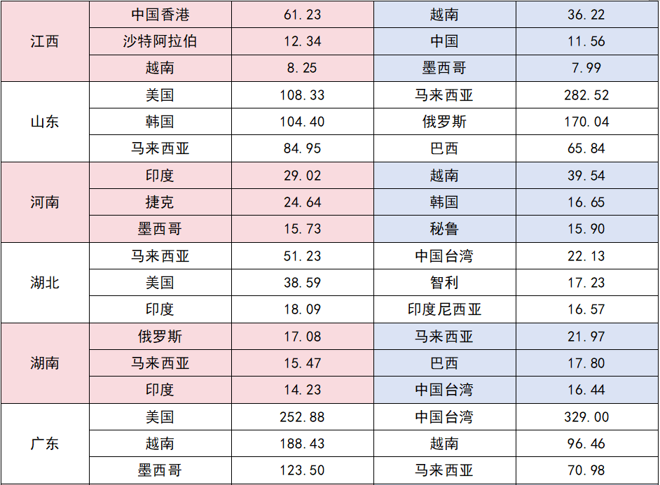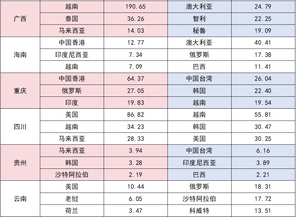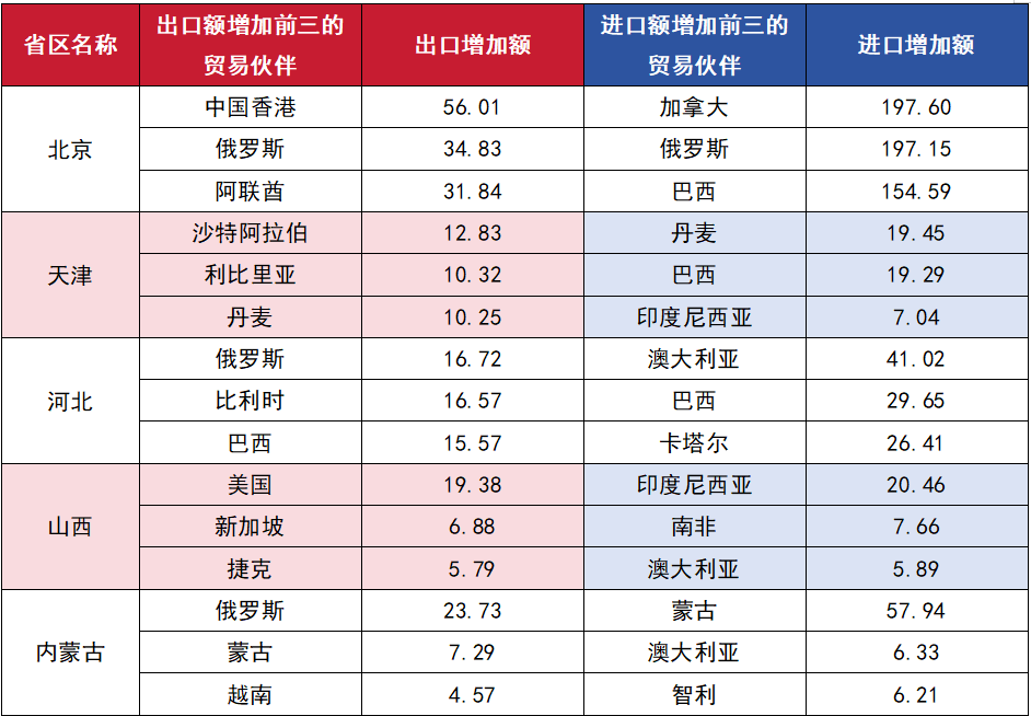 表10 2017年到2024年各省区进/出口额增加前三的贸易伙伴(单位:亿美元)