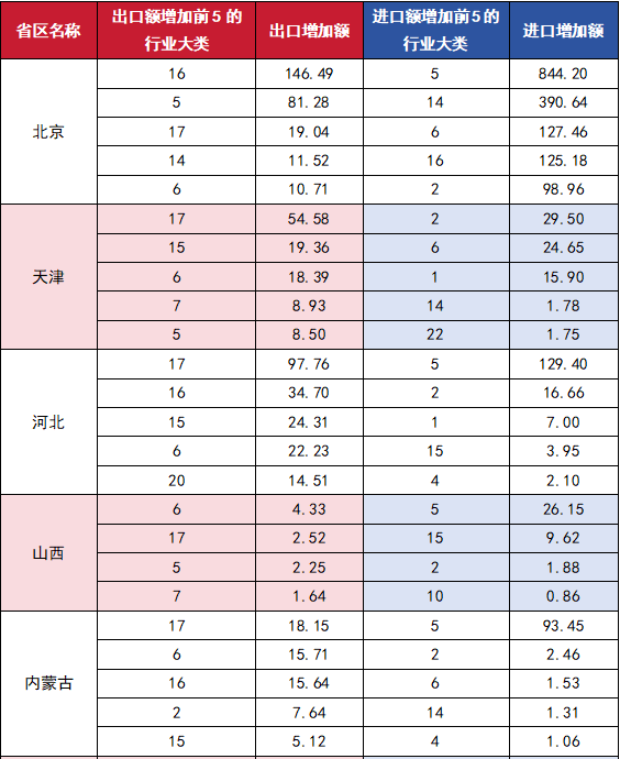表12 2017 年到2024年各省区进/出口额增加前五的行业大类(单位:亿美元)