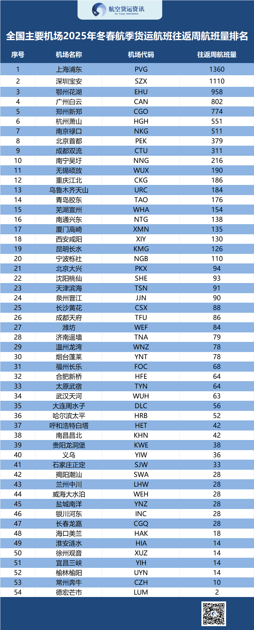 第一部分:全国主要机场2025年冬春航季货运航班往返周航班量排名