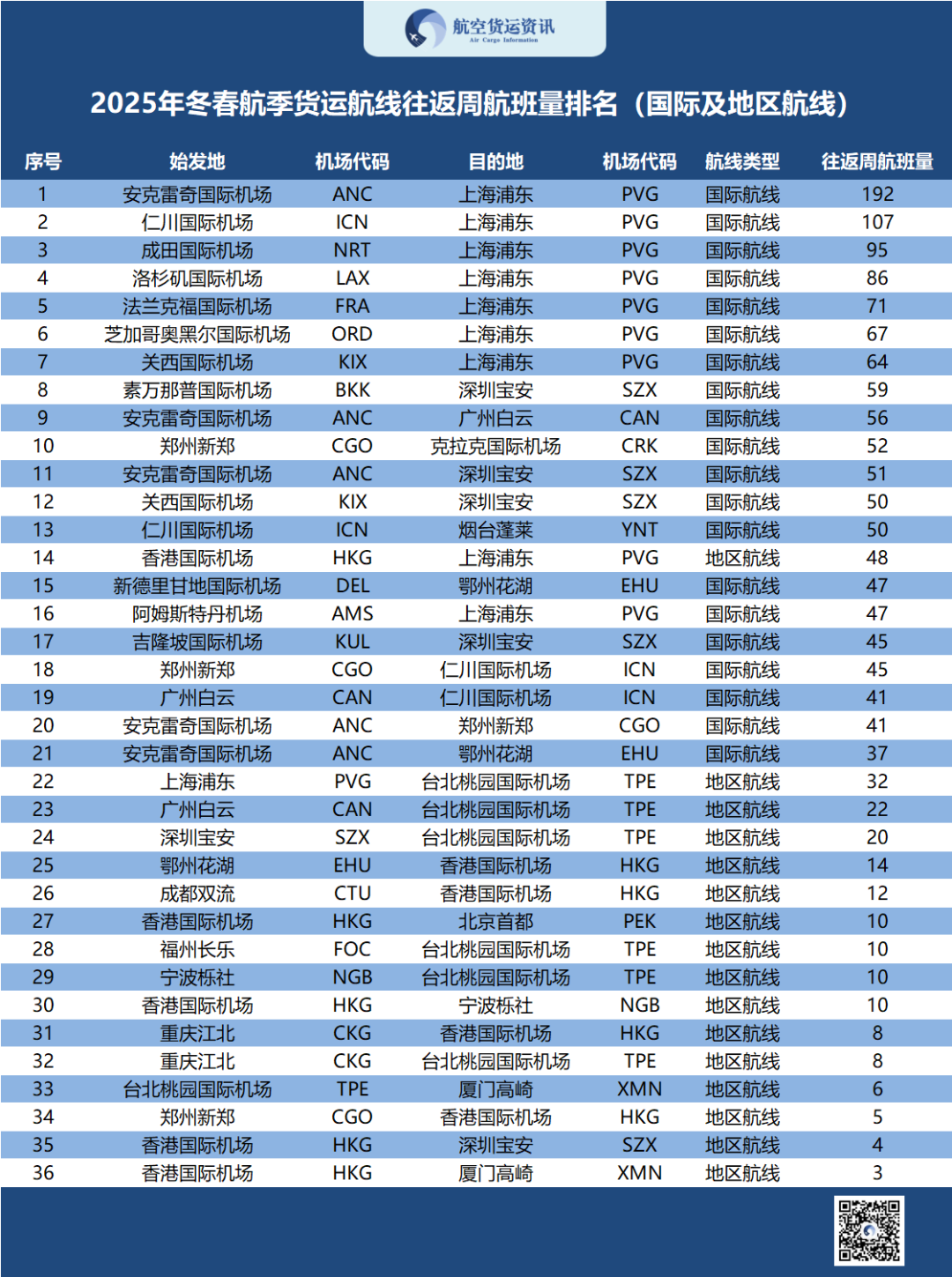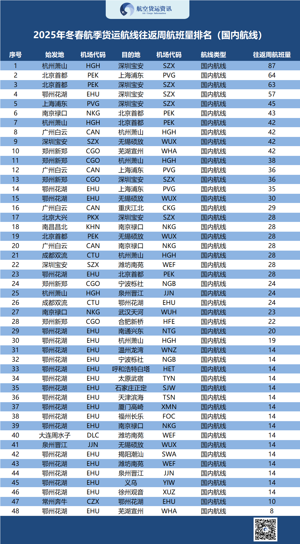 第二部分:2025年冬春航季货运航线往返周航班量排名(分国内航线、国际和地区航线)