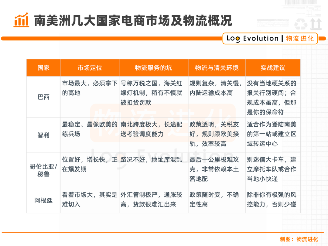 很多刚进南美的跨境卖家容易犯一个错误,以为选择一套物流服务的方案就能复制到整个南美洲。大错特错!南美这块地界,不仅地理上被安第斯山脉切得七零八落,政策和市场环境更是严重的碎片化。这篇重点分析几个核心国家:巴西、智利、哥伦比亚、秘鲁、阿根廷。