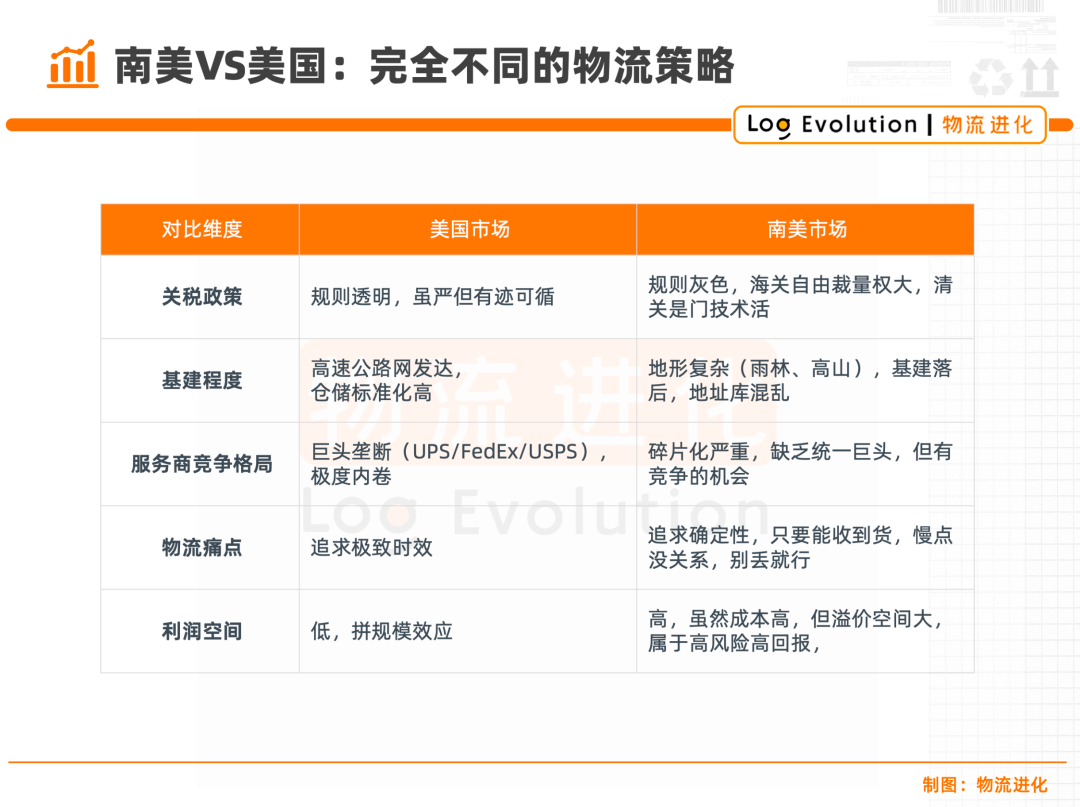 很多做惯了北美市场尤其是美国的跨境电商老板们,总是拿着美国的成功经验直接往南美套,这是万万不能的。因为在这两地方选物流服务商的底层逻辑完全是反着来的(见表格对比)。